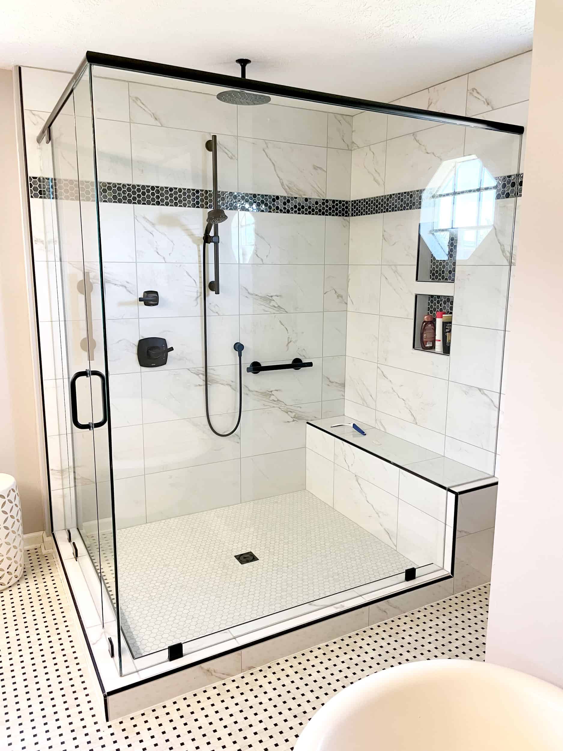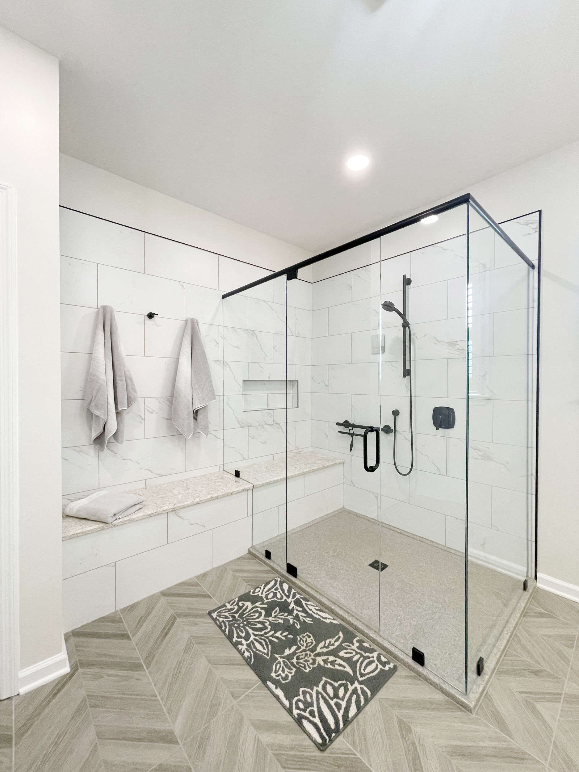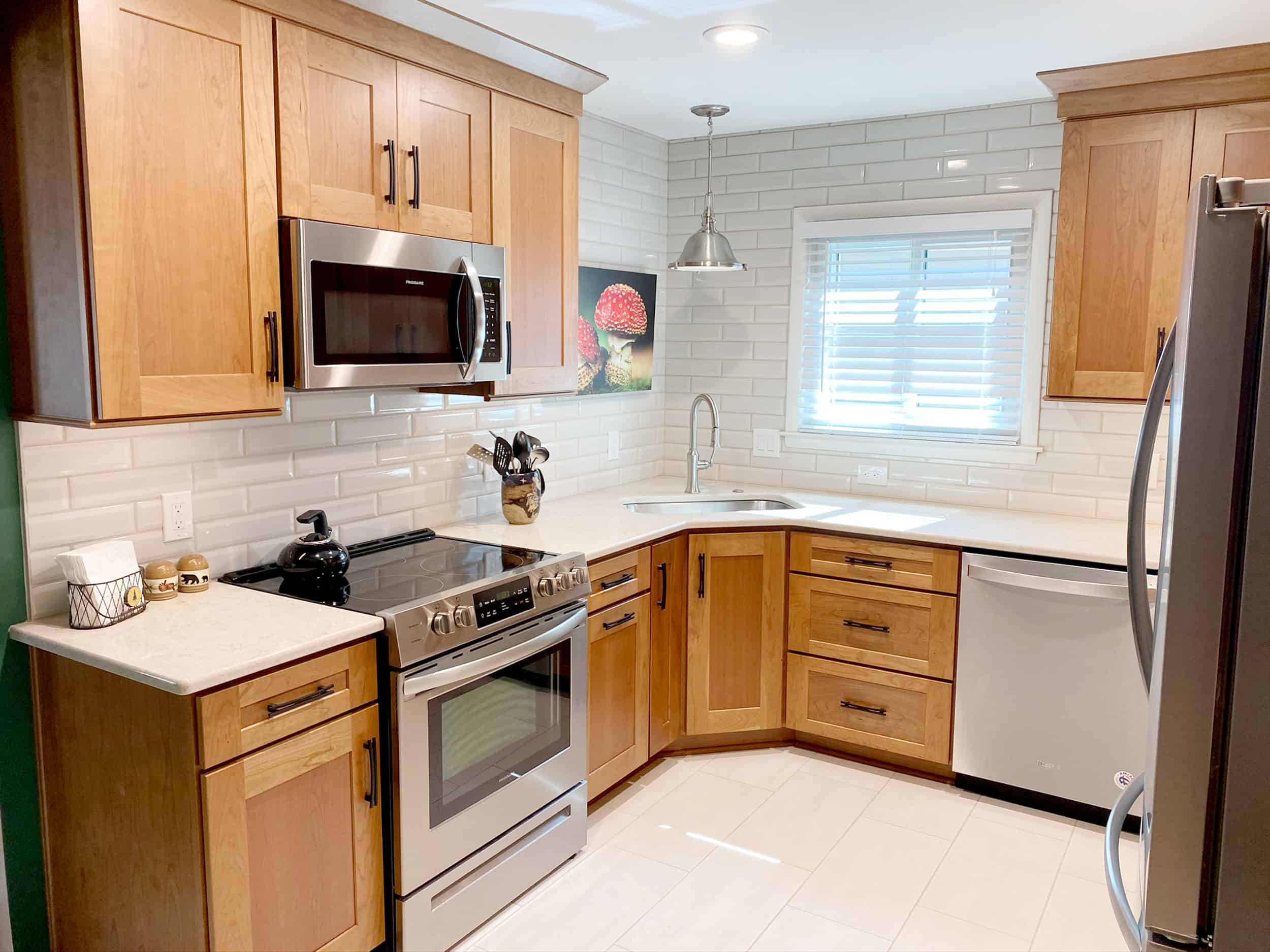 Next is another Gladeview Kitchen Remodel and Bathroom Remodel. The first highlights the beauty of cherry wood cabinets with a natural finish and classic shaker-style doors, drawers, and crown molding. The second highlights a large Onyx Collection solid surface shower base with low profile curb installed with an extra-long, quartz-topped bench.