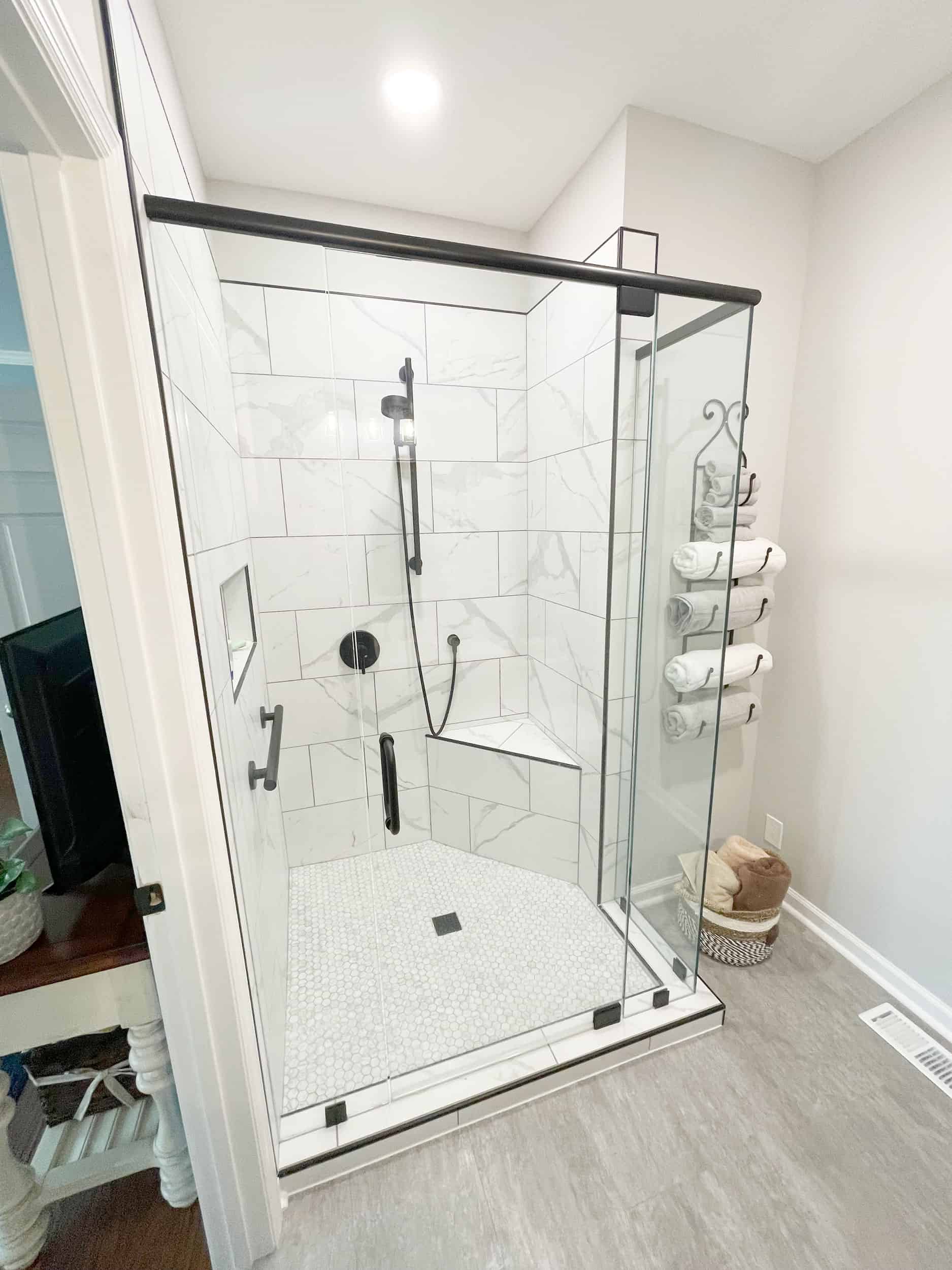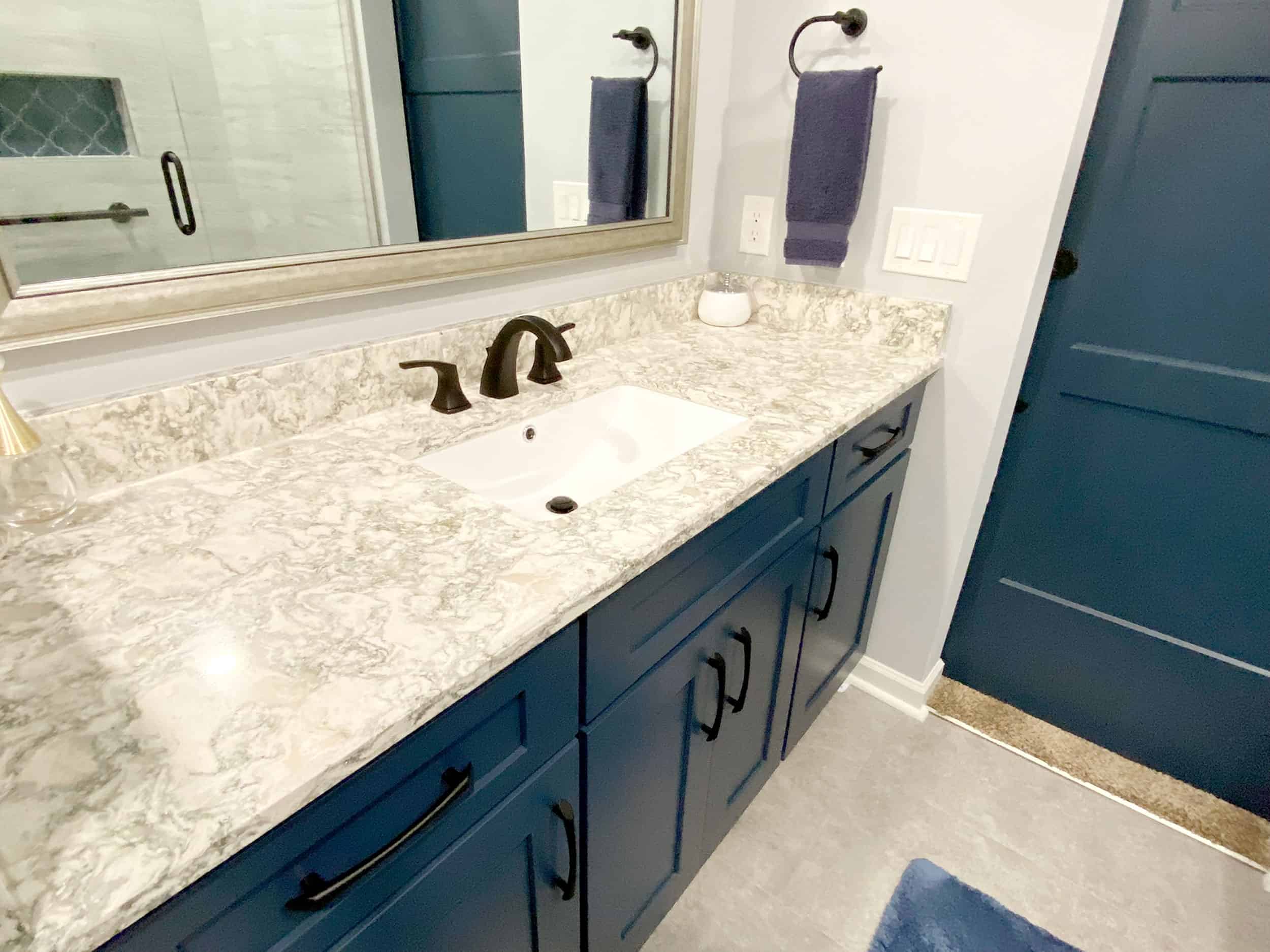 The first Hermitage Bathroom Remodel we show highlights eye-catching navy-blue cabinets and a matching barn door accented with matte black plumbing fittings and accessories.