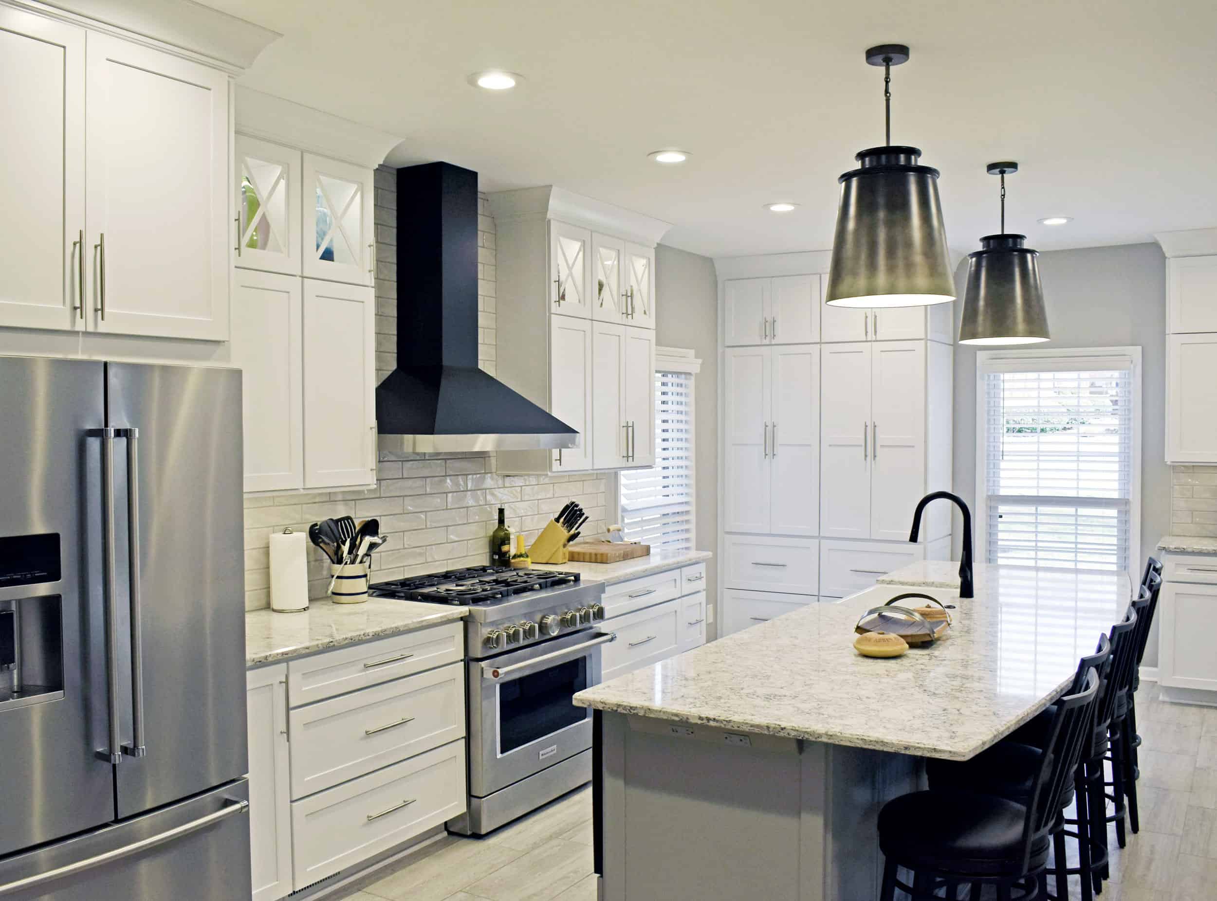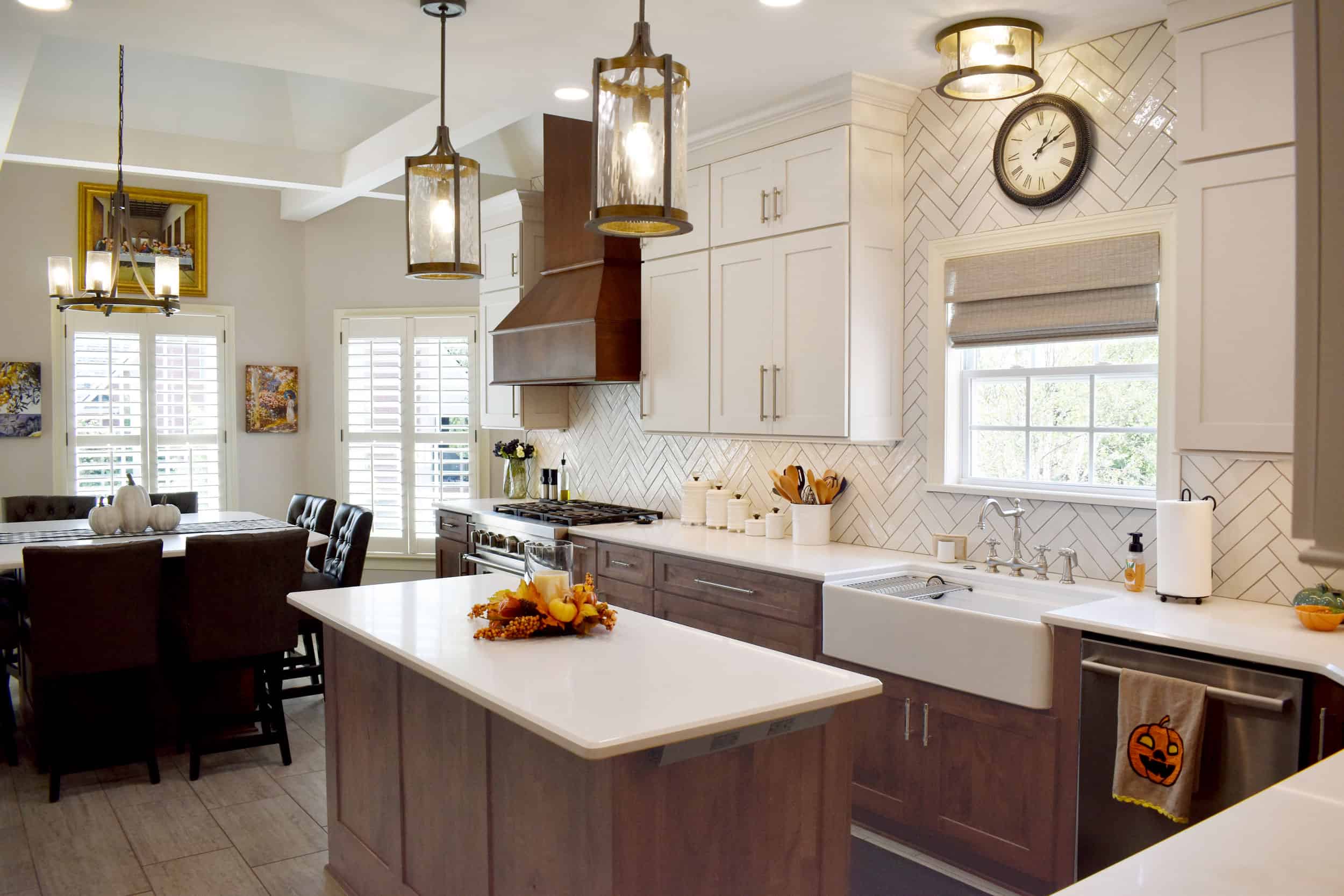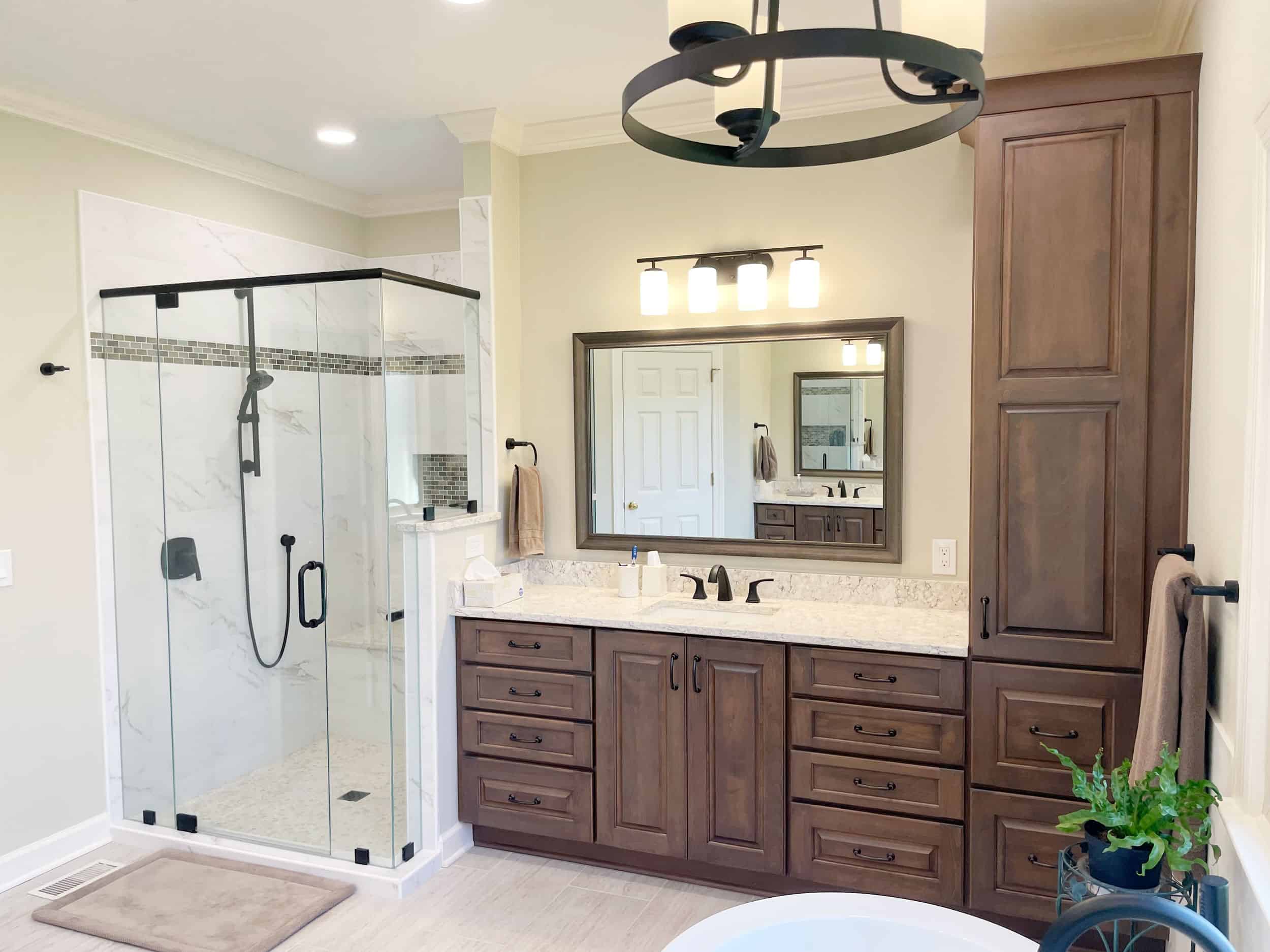 Next are another Lebanon kitchen remodel and Lebanon bathroom remodel. The first highlights a beautiful combination of stained and painted cabinetry. Handcrafted “subway” tiles laid in a herringbone pattern provide a dramatic backdrop. The second highlights an abundance of storage space for “his” vanity with 10 drawers and a tall linen cabinet.